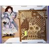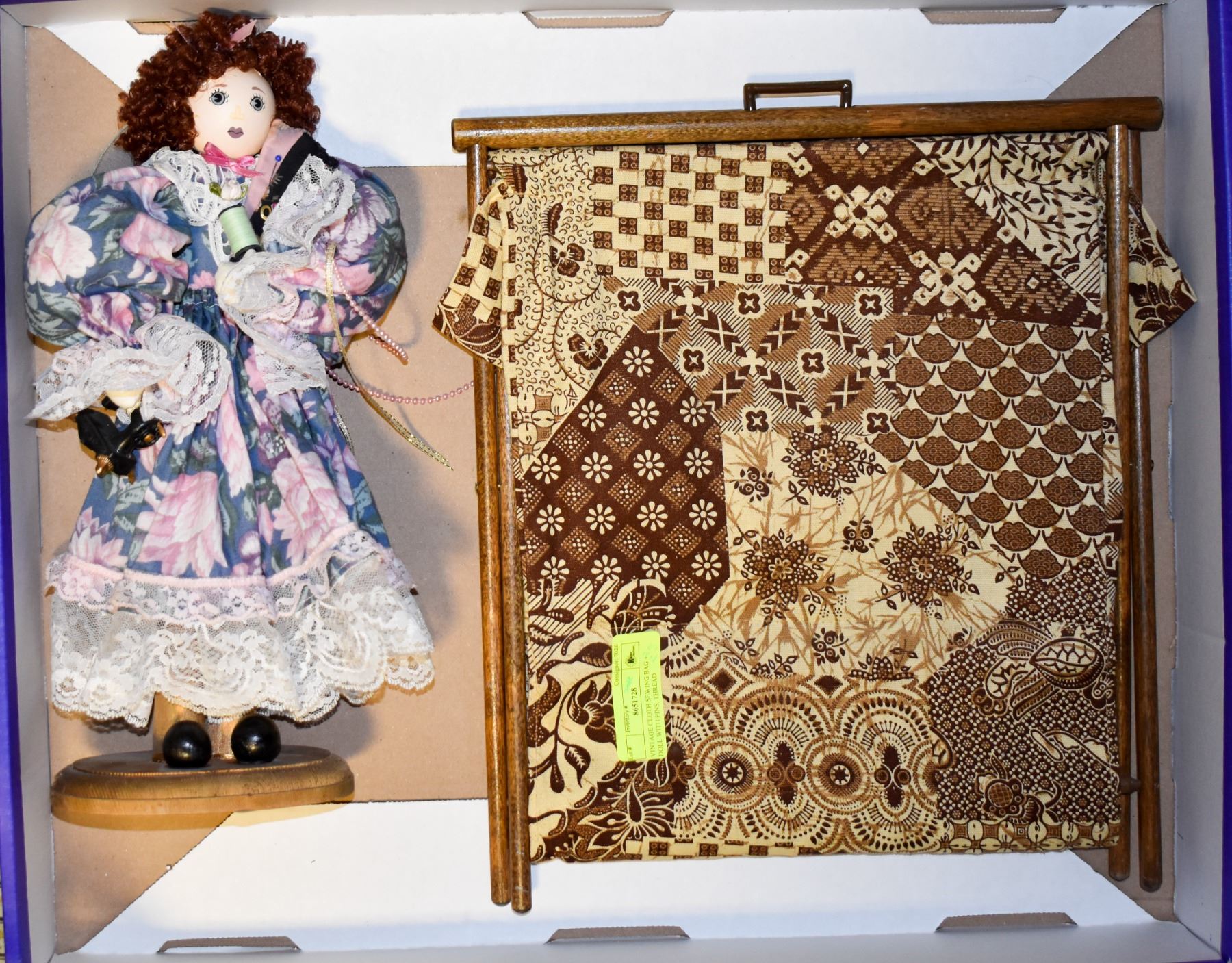 VINTAGE CLOTH SEWING BAG + DOLL WITH PINS, THREAD