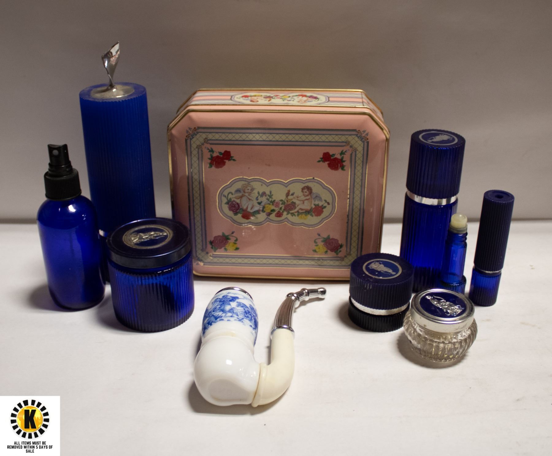 VINTAGE COBALT AVON CONTAINERS, DCOR TIN (K)