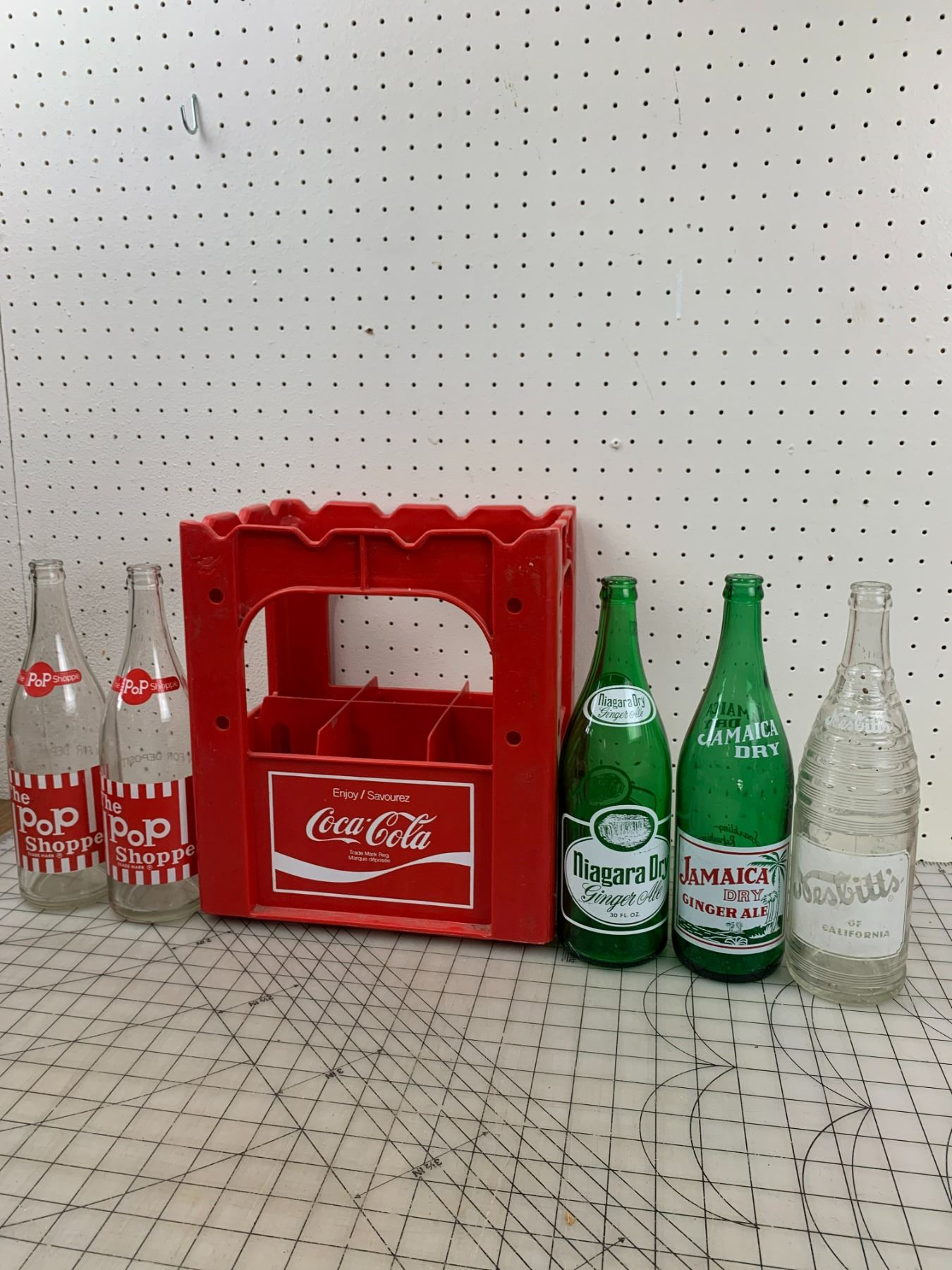 VINTAGE COCA-COLA CRATE AND LARGE GLASS POP BOTTLES