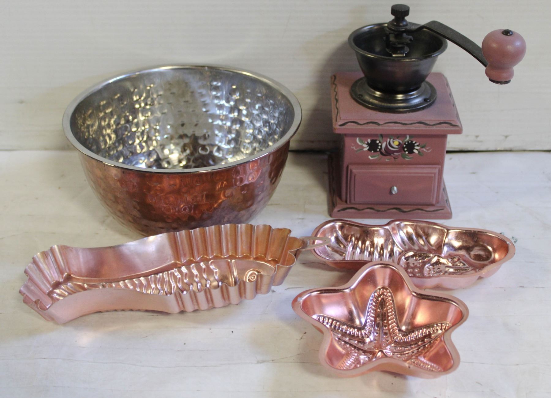 VINTAGE COFFEE GRINDER, COPPER MOLDS & BOWL