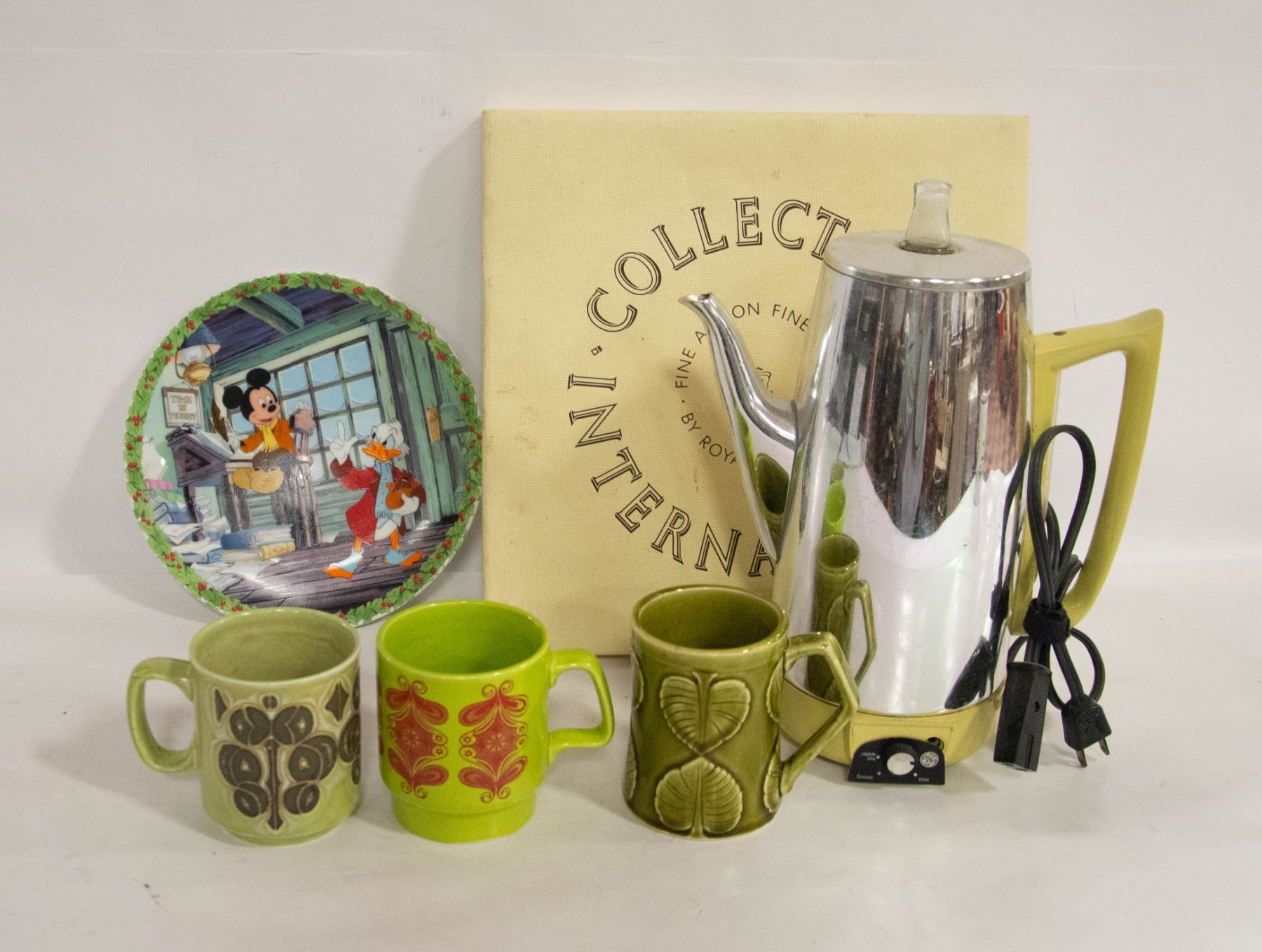 VINTAGE COFFEE POT, THREE VINTAGE MUGS