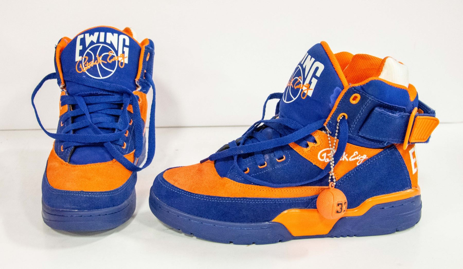 BLUE/ORANGE HI TOP ATHLETIC FOOTWEAR (FEW MARKS ON ONE SHOE) IN ORIGINAL BOX - MENS SIZE 9.5 (LADIES APPROX. SIZE 11) (EBAY SELLS FOR $150-200)