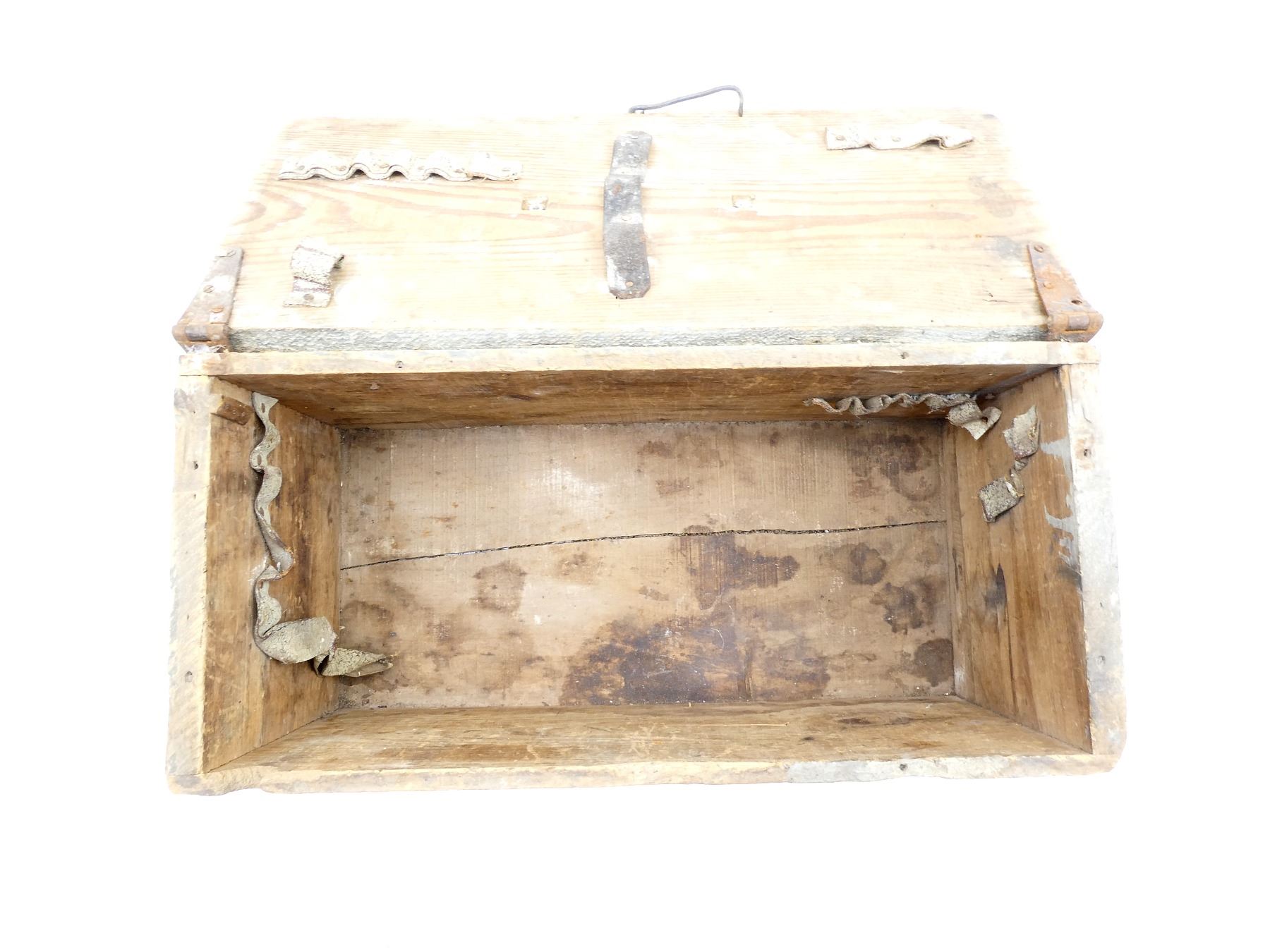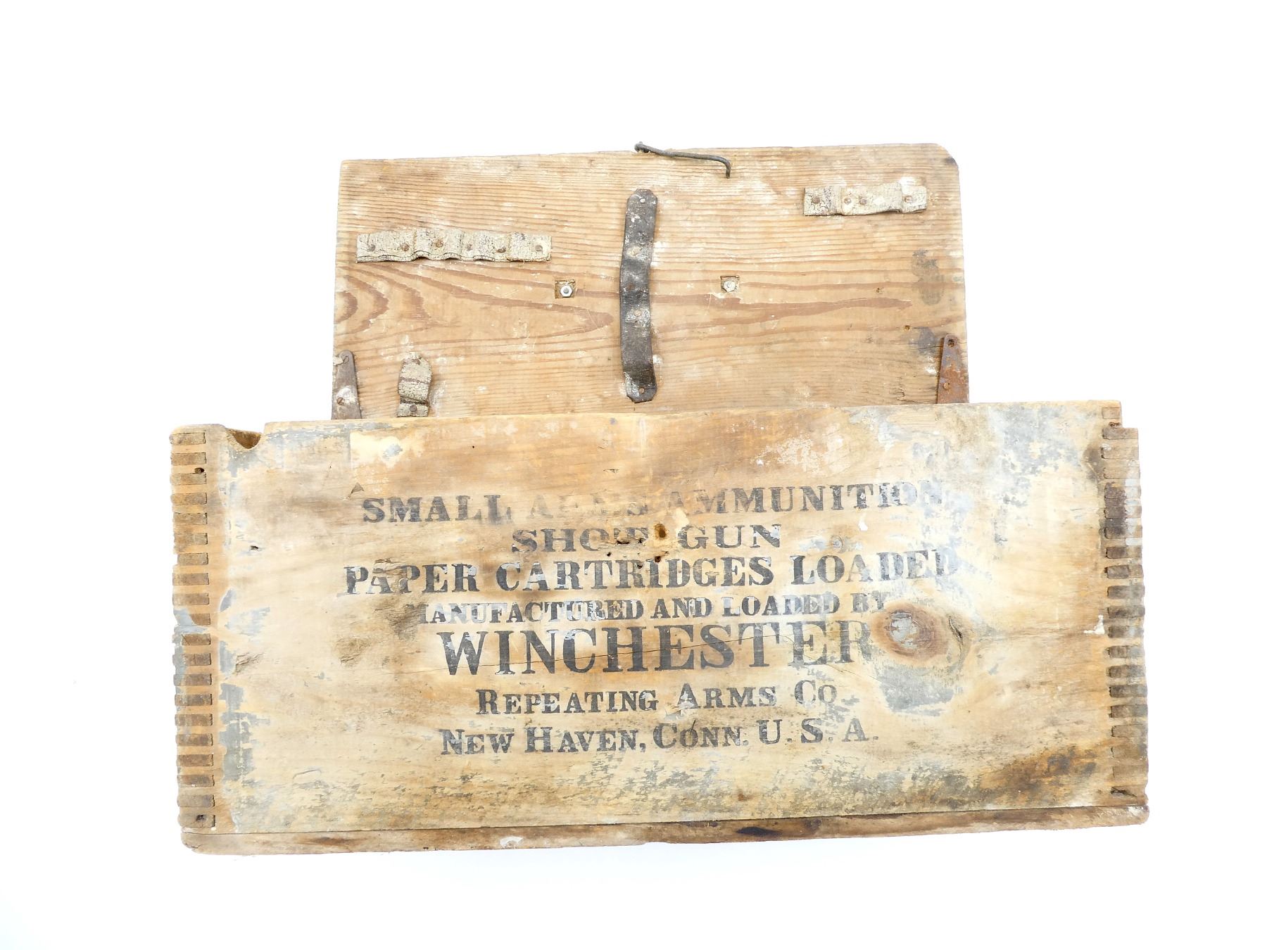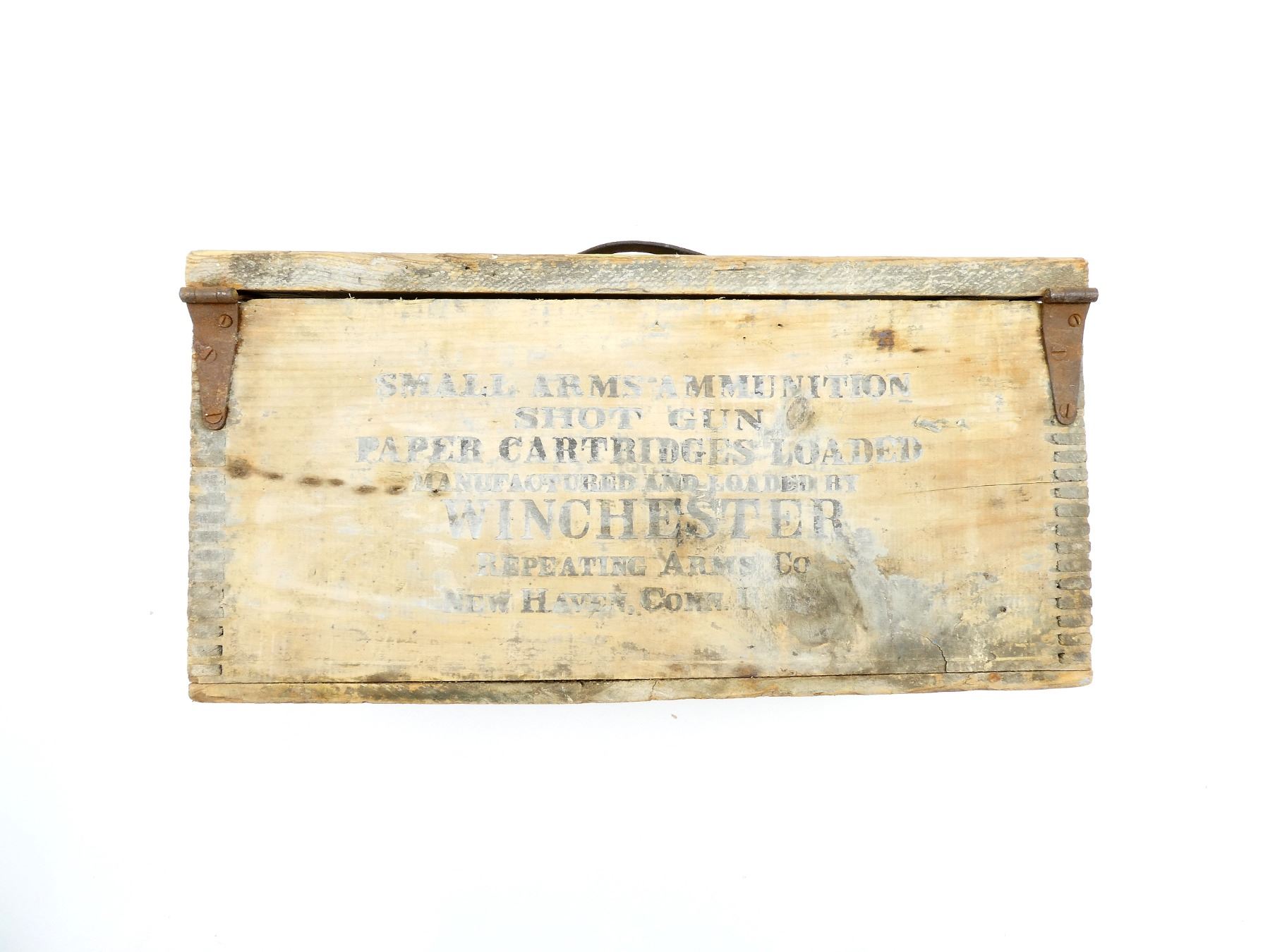 (1) WOODEN CRATE WITH BROWN LEATHER CARRYING HANDLE & METAL FITTINGS, MARKED: "WINCHESTER", "SMALL ARMS AMMUNITION, SHOT GUN", ETC., APPROX. 20.5" X 10" X 11". SEE PHOTOS.