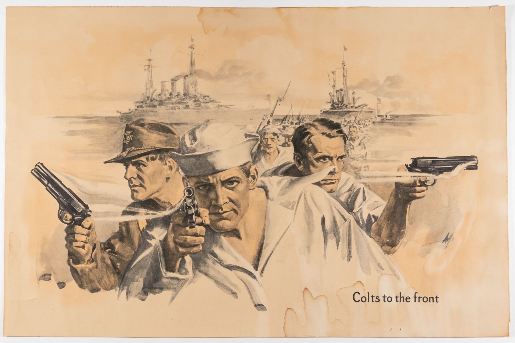 Colts to the Front', showing three U.S. Navy soldiers holding Colt handgun, 14.5 x 22 inches. Dampness stain and two small pinholes at bottom margin, else good.