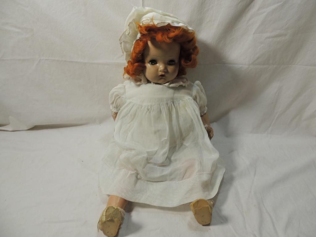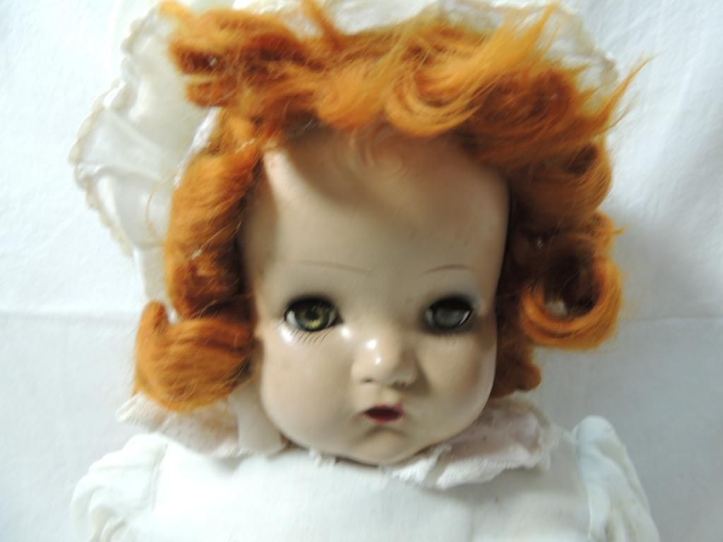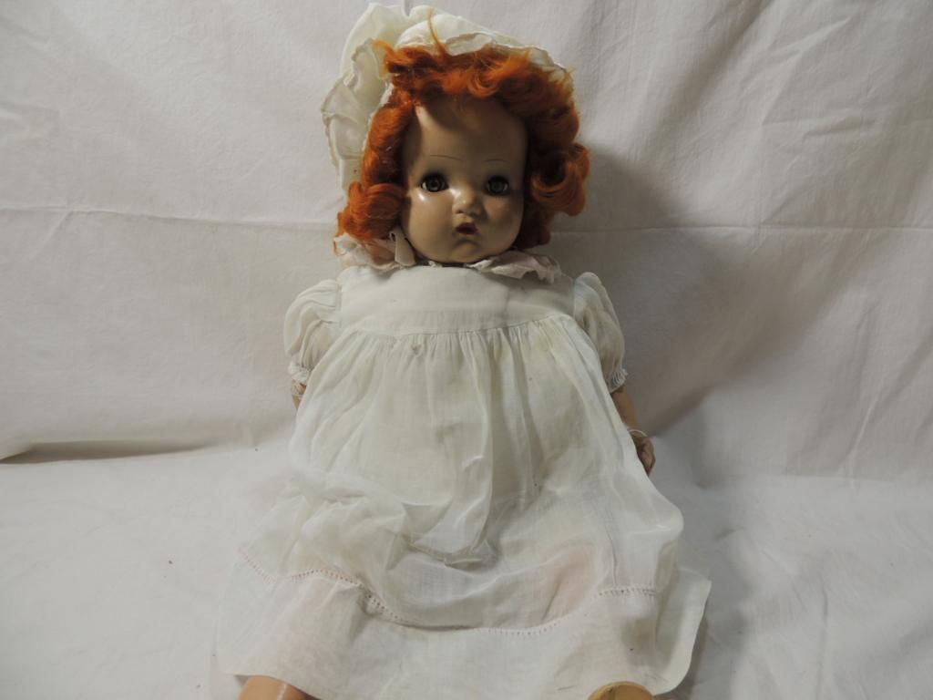 VINTAGE COMPOSITE DOLL WITH RED HAIR AND WHITE DRESS. WAKE EYES. AS SHOWN. SEE PHOTO FOR MORE DETAILS.