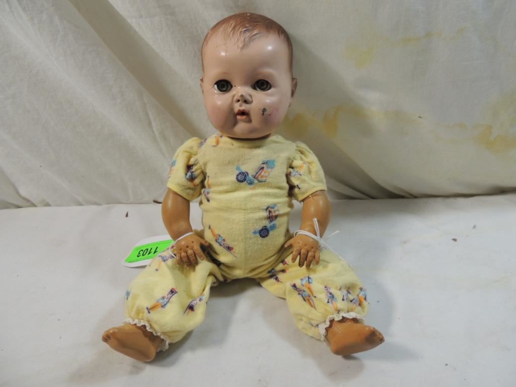 COMPOSITION HEAD SLEEP EYES OPEN MOUTH, VINYL ARMS AND LEGS. GOOD CONDITINO AS SHOWN SEE PHOTO FOR MORE DETAILS.