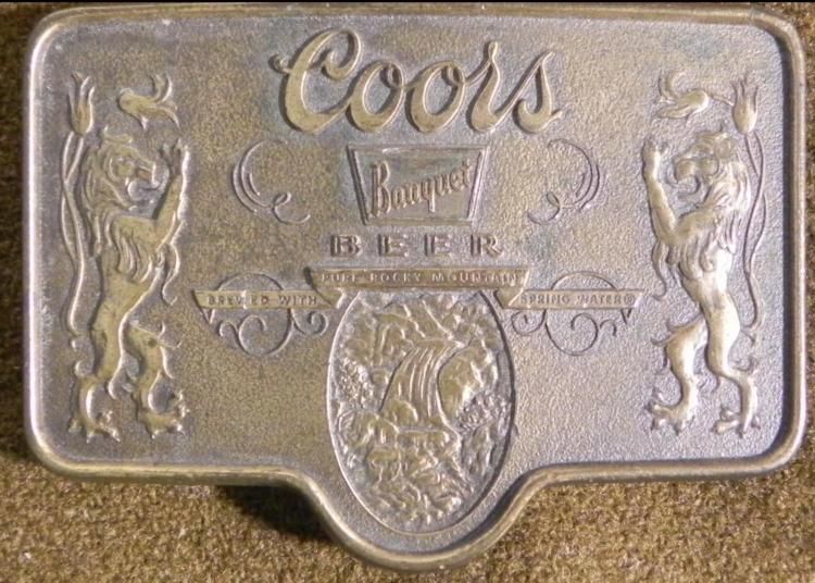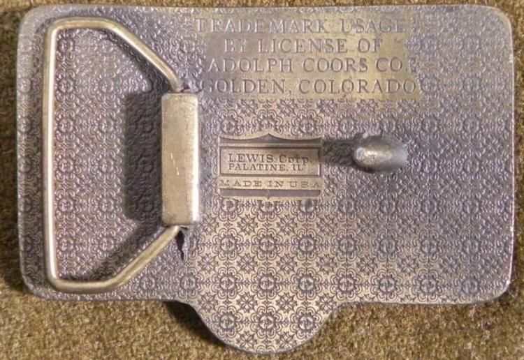 THIS IS A VINTAGE "COORS" BEER BRASS BUCKLE THAT IS INSCRIBED ON REVERSE. THE BUCKLES DIMENSIONS ARE 2 1/2" X 3 1/2". *