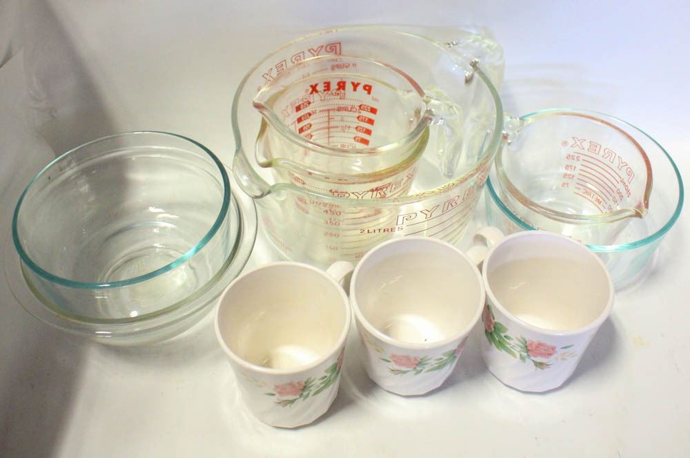 VINTAGE CORNINGWARE COFFEE CUPS, PYREX BOWLS &
