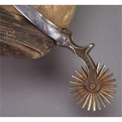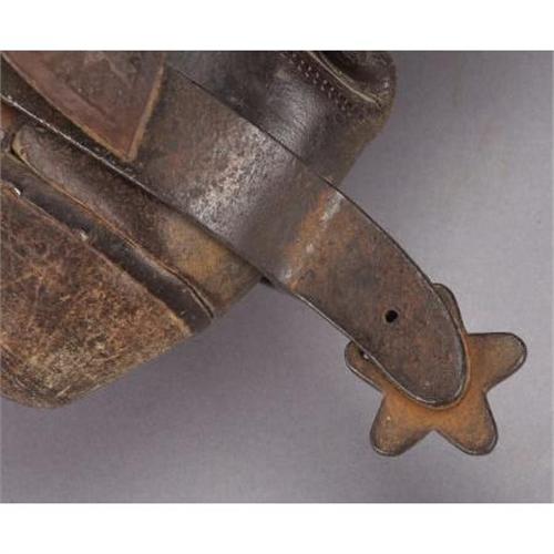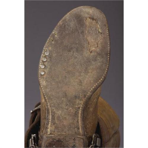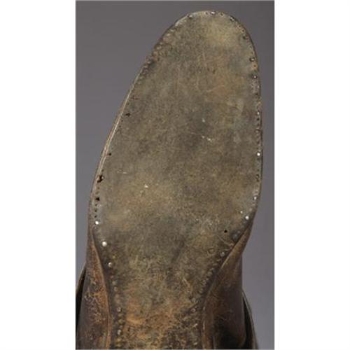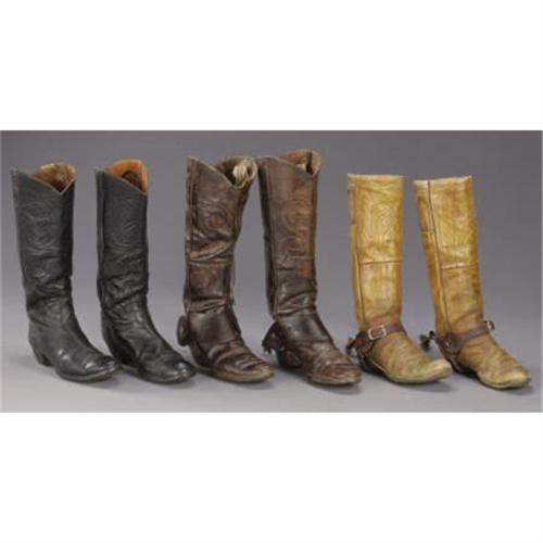 <B>VINTAGE COWBOY BOOTS AND SPURS</B></I> - <BR> a)High top boots; 18½” tall; circa 1890; Fancy stitching; Great profile; Classic styling with cloth pulls; Spurs are circa 1950's; Crocketts; Brown spurs with flower dome overlay; Contemporary dove wing leathers. Boots are well worn, patched and stitching is rotting. Spurs retain very little of their original plating; marked on edge.<BR>b) Light brown stove pipe style boots with cloth pulls; Fancy stitching; Circa 1900; Spurs are late unmarked North & Judd drop shanks with new straps.<BR>c) 17” tall; Circa 1920's; Black boots with riding heels and wing tip toes; Swirl stitch pattern on uppers.<BR><BR><b>Shipping:</b> Clothing, Costumes & Jerseys (<a target="_blank" href="http://www.heritageauctions.com/common/shipping.php">view shipping information</a>)