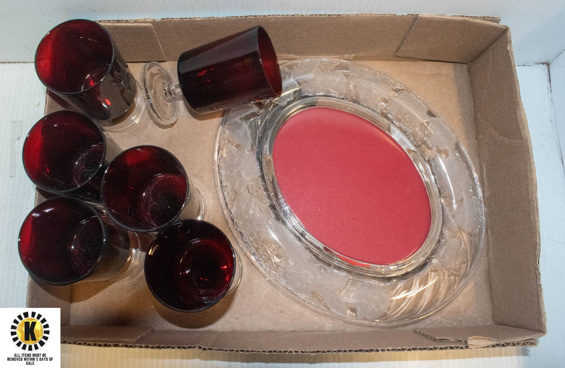 VINTAGE CRANBERRY GLASSWARE 6 CUPS + PLATE