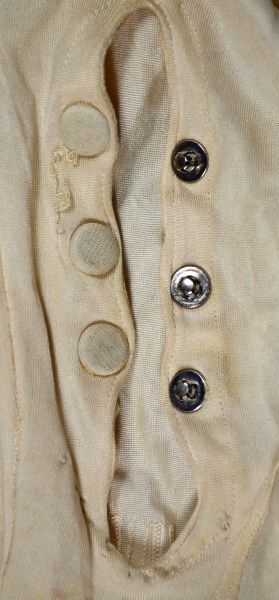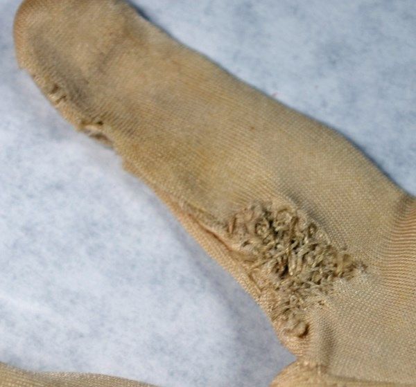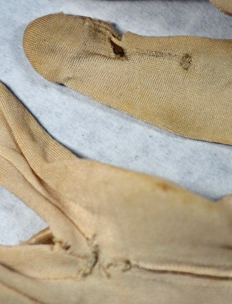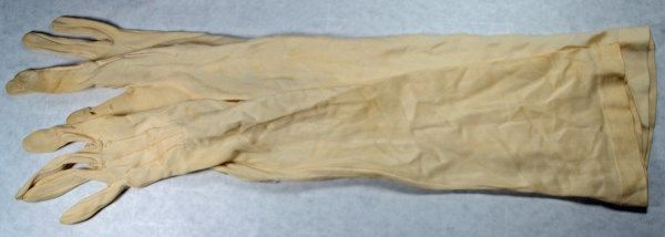 VINTAGE CREAM LONG NYLON LADIES OPERA GLOVES WITH SNAPS AT THE WRISTS. THERE IS WEAR, HOLES, TEARS AND AGE STAINS ON THESE GLOVES. EST VALUE $20-30.00