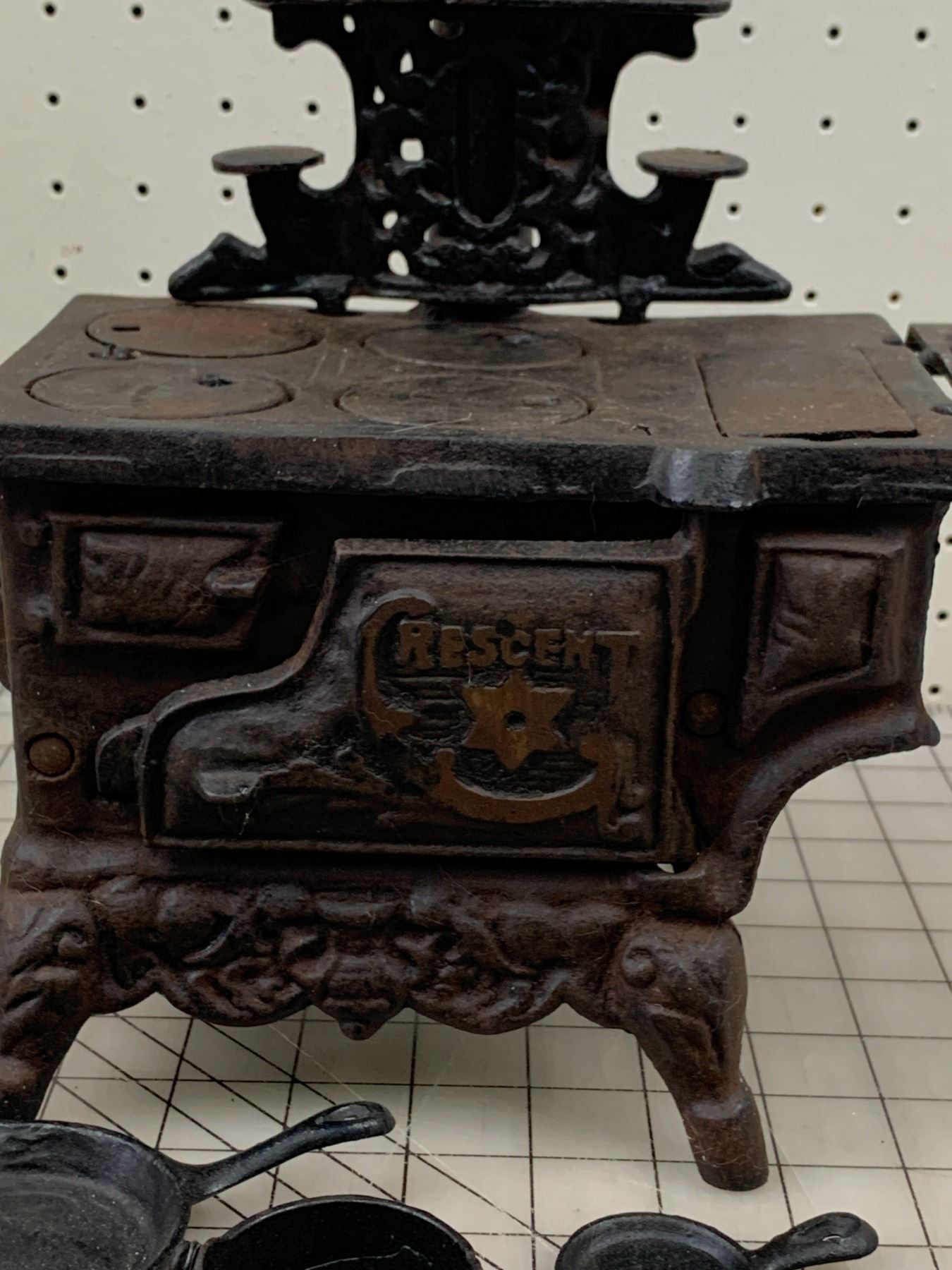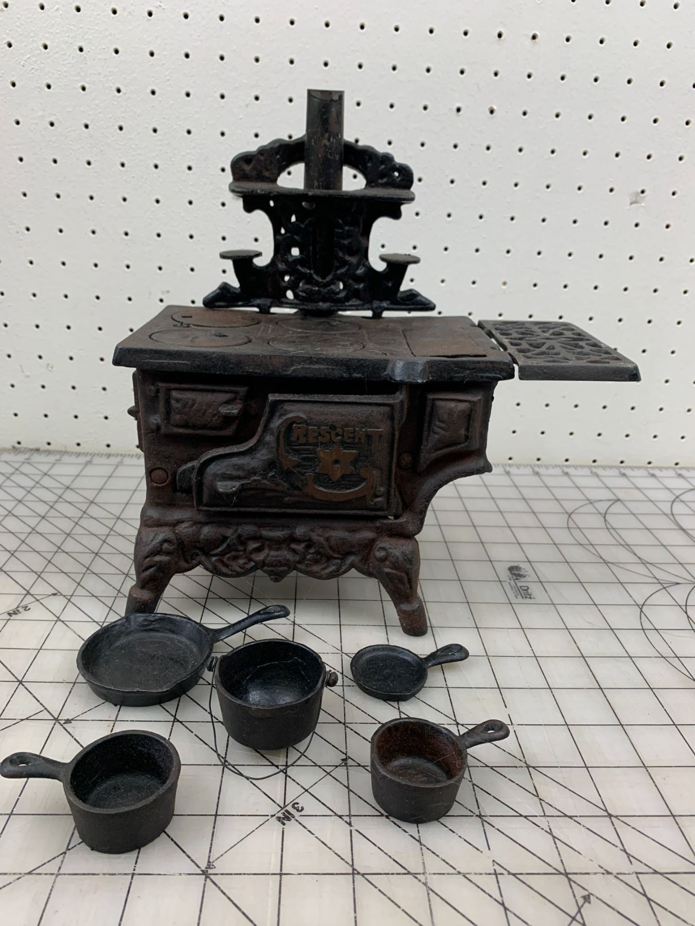 VINTAGE CRESCENT CAST IRON MINIATURE COOK STOVE AND POTS