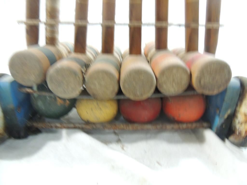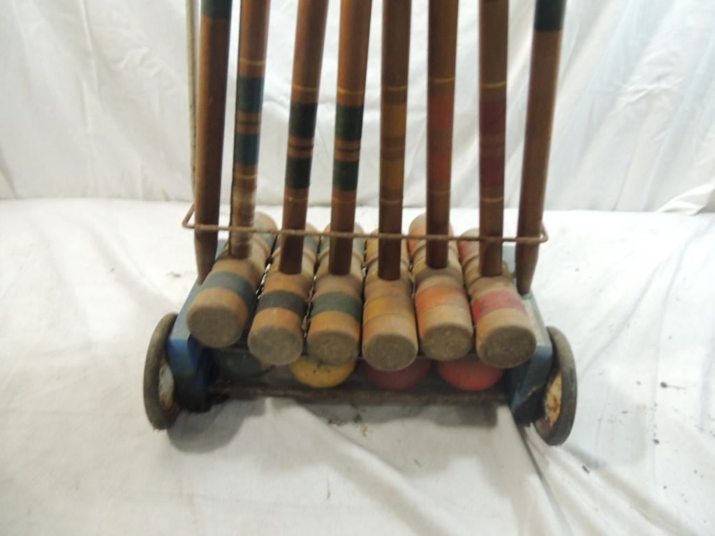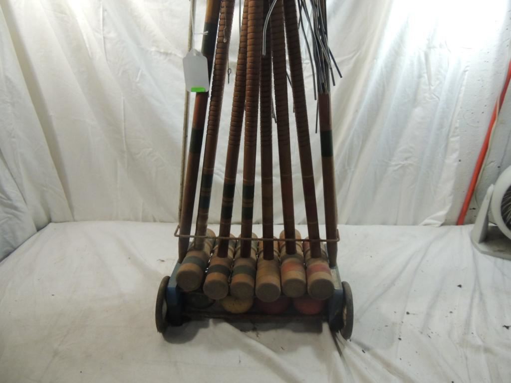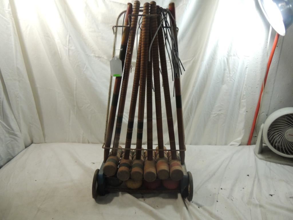 6 PLAYER SET, STAND WITH WHEELS, COLLECTIBLE VINTAGE CROQUET SET, VINTAGE SET, OUTDOOR FUN, FAMILY FUN, CROQUET EQUIPMENT, AS SHOWN SEE PHOTO FOR MORE DETAILS.