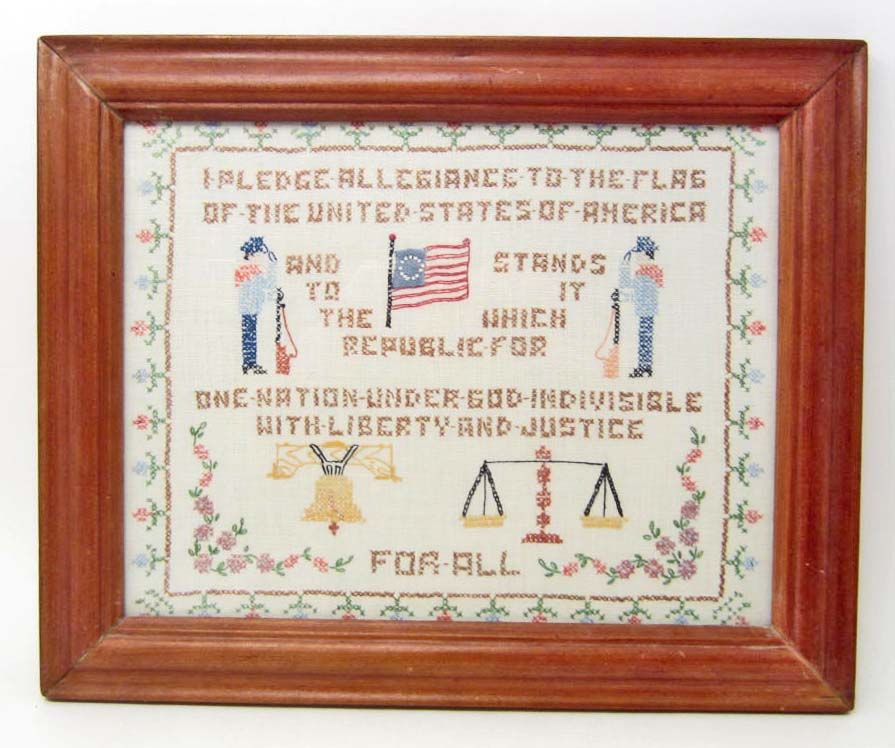 Features the Pledge of Allegiance among patriotic images. Measures approx 16-1/2" x 13-1/2"