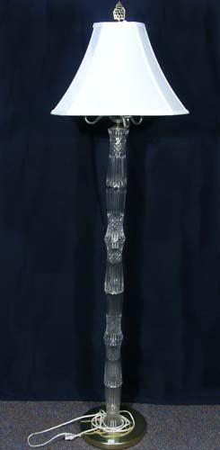 A round brass base supports a tall Windsor cut crystal lamp with white linen shade. Excellent condition. 59" high.