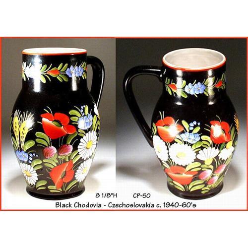 If you are REALLY interested in this item, please note that for Ebay Live Auction only bids at or above $120 will be successful and meet our reserve. Beautiful Czech Peasant Art pottery pitcher with hand painted field flowers and wheats on the black background. Excellent condition, no chips or cracks. Czechoslovakia circa 1950-60's. Dimension : 8-1/8" high. This piece is listed in "Czechoslovakian Pottery" by Bowers, Closser, Ellis, see #534, page 89 ($175). Please note that in some cases photo sizes are automatically reduced, so if you want to see full size or detailed pictures, please email us ()
