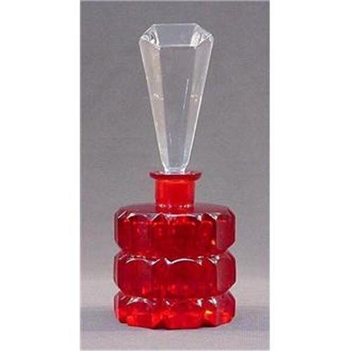 ORIGIN <BR>CZECHOSLOVAKIA BOTTLE <BR> RUBY RED CASED GLASS ? HIGHLY CUT & POLISHED <BR><BR> STOPPER<BR> CRYSTAL FACETED MEASUREMENTS <BR> 6? TALL X 2 3/8? WIDE AGE<BR>VINTAGE 1940?S CONDITION <BR>EXCELLENT / UNUSED ? NO DAMAGE!!