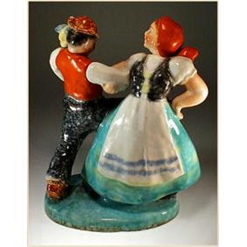 Scarce hand painted, glazed Art Pottery figure depicting dancing couple in Czech/Moravian native costumes. This is fairly large piece, not found in any publications on subject. Excellent condition, no chips, cracks or repairs. Dimension approx. 9" high and 8" wide. Made by Ditmar Urbach (Teplitz), base is signed Made in Czechoslovakia, circa 1930-50's. This extremely scarce piece would be great addition to your Czech Pottery collection!!!