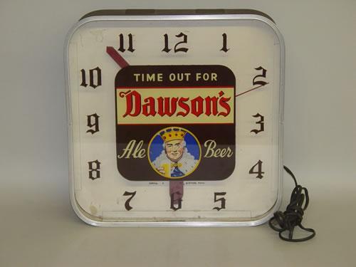 VINTAGE DAWSON'S ALE & BEER ADVERTISING ELECTRIC WALL CLOCK W/ REVERSE PAINTING ON GLASS KING LOGO "TIME OUT FOR DAWSON'S" (15 1/2" X 15 1/2")