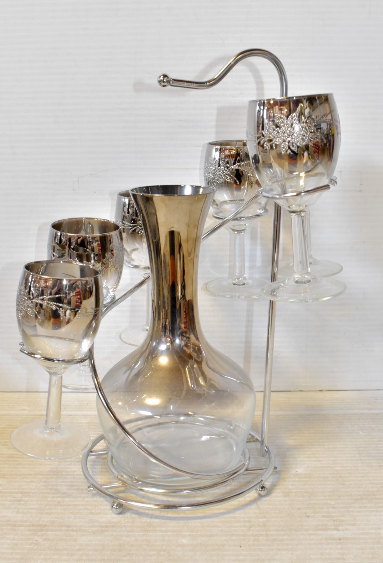 DECANTER AND 6 GLASSES IN STAND. STAND IS 12" TALL