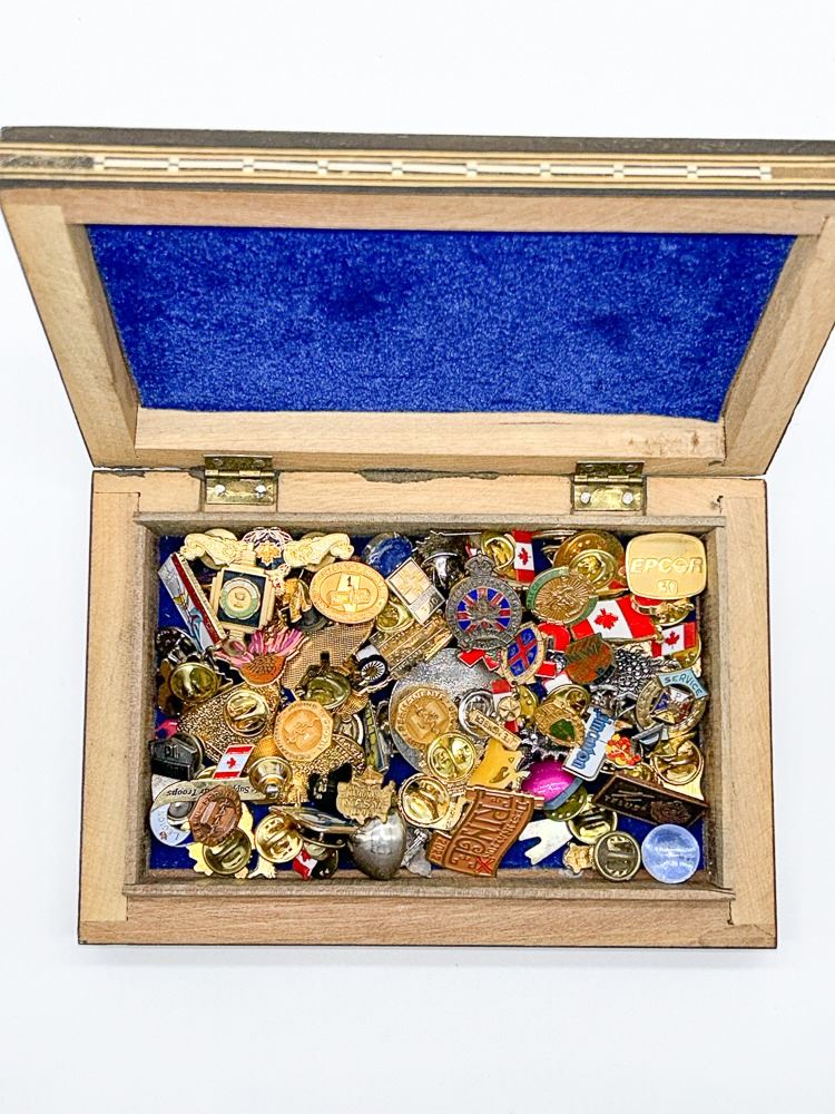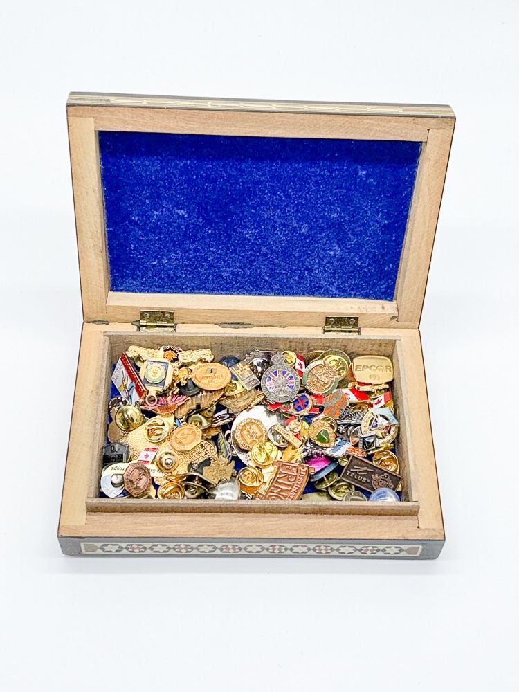 VINTAGE DECORATIVE BOX CONTAINING MANY VINTAGE/ANTIQUE LAPEL PINS