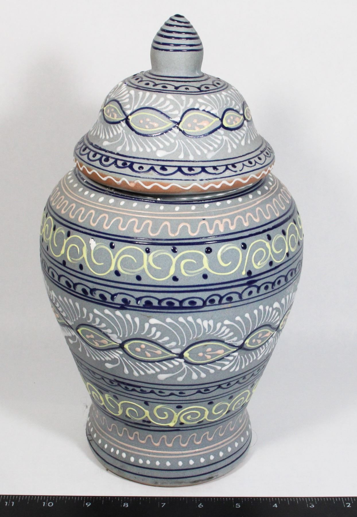 VINTAGE DECORATIVE CERAMIC VASE WITH LID.SARLOR INSCRIBED ON THE BOTTOM OF THE VASE.