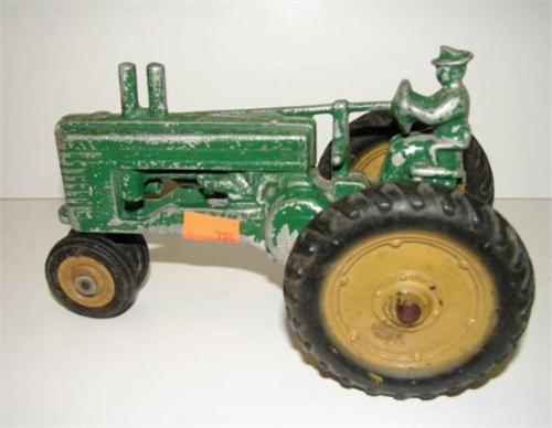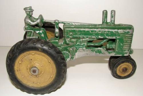 VINTAGE DIE CAST JOHN DEERE TRACTOR. Shows wear and major loss to paint. 7" L