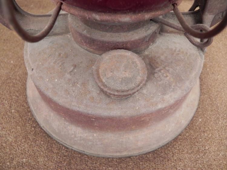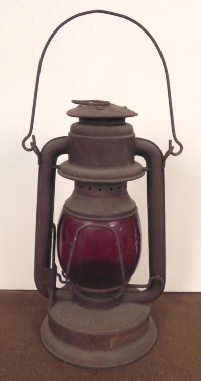 VINTAGE DIETZ RAILROAD LANTERN-"LITTLE WIZARD"-KEROSENE * * 16" WITH WIRE HANDLE UP-DARK RED GLASS ON THIS OLD BEAUTY *