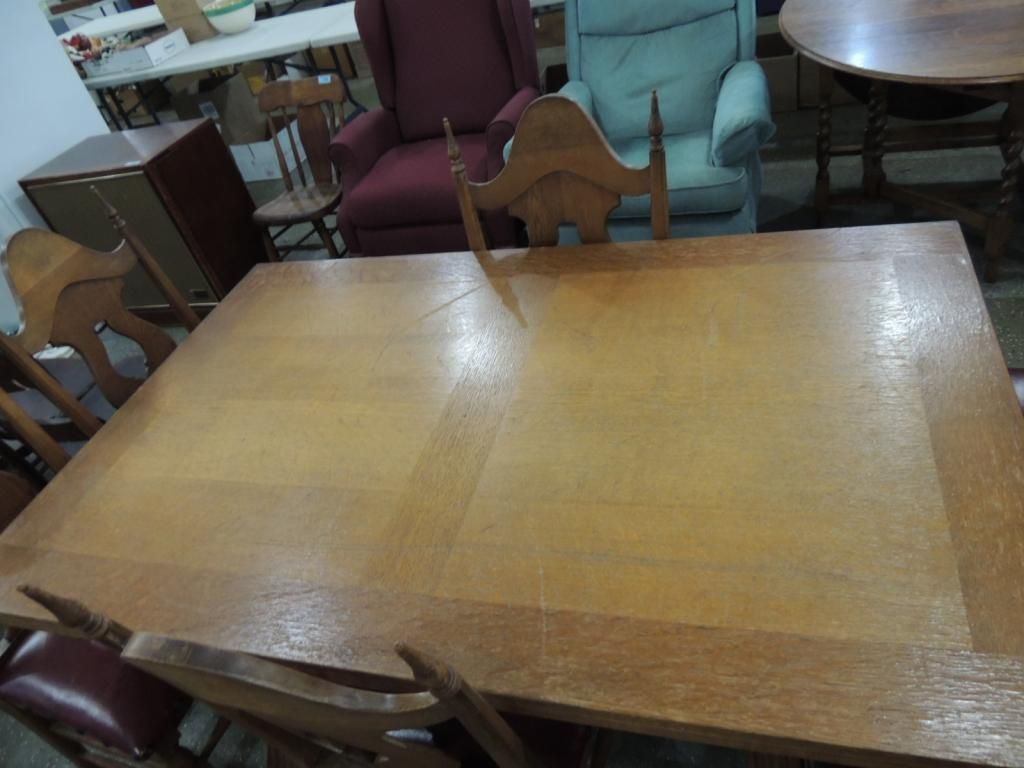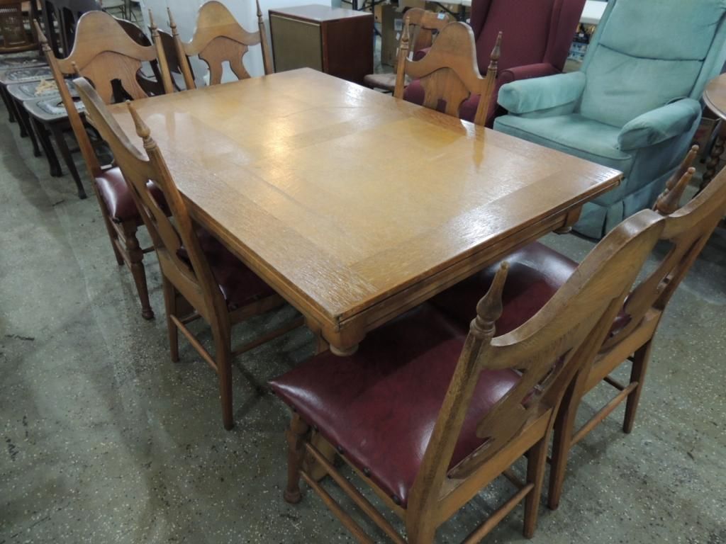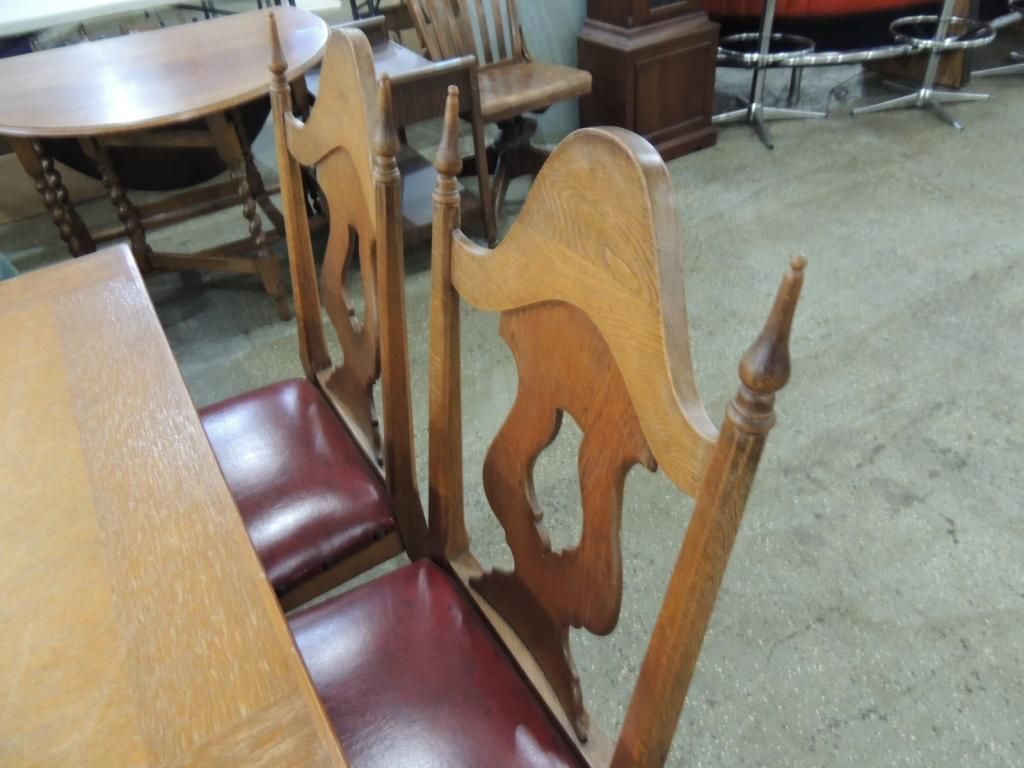MEDIVIAL RENISANACE ERA? DINNING TABLE AND CHAIRS. TABLE 56" X 36" CHAIRS WITH RED SEAT. AS SHOWN SEE PHOTO FOR MORE DETAILS.