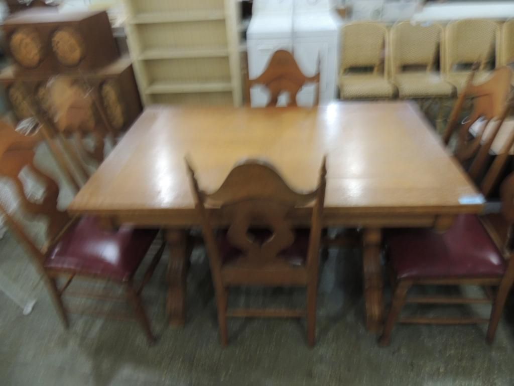 MEDIVIAL RENISANACE ERA? DINNING TABLE AND CHAIRS. TABLE 56" X 36" CHAIRS WITH RED SEAT. AS SHOWN SEE PHOTO FOR MORE DETAILS.