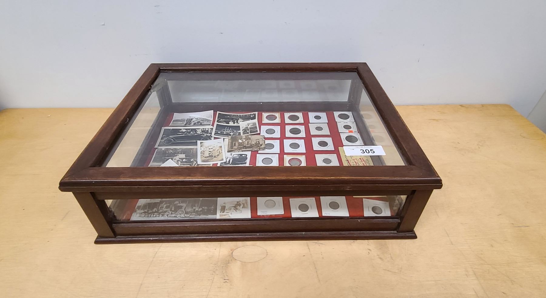 CASE APPROX 6" X 22" X 17"INCLUDES 13 VINTAGE PHOTOS W/CARS, NINE 1922-1936 CANADIAN NICKELS, 1902/05/07 US INDIAN HEAD PENNIES, 1927 & FOUR 1932 CANADIAN ONE CENT COINS, 1912/20/30 BRITISH LARGE PENNIES & 1944 1ST STATE BANK CHEQUE W/CHIEF WHITE CLOUD
