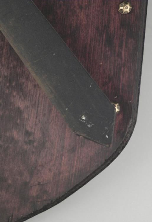 VINTAGE DOUBLE CROSSED MEDIEVAL SWORDS ON A WOOD SHIELDVERY WELL MADE WOOD SHIELD WITH 2 CROSSED SHORT SWORDS WITH METAL BLADES AND WOOD GRIPS-APPROX 16X25"