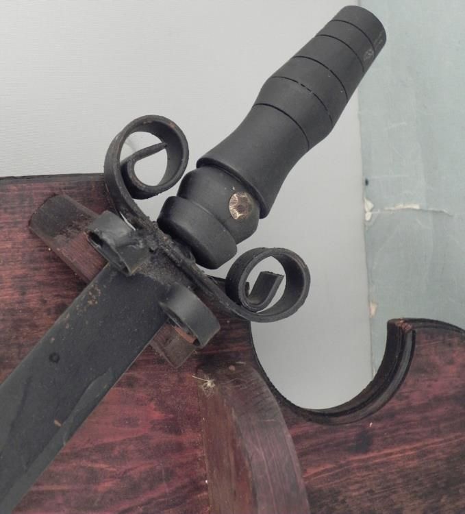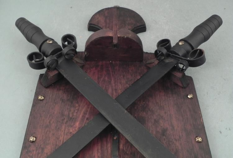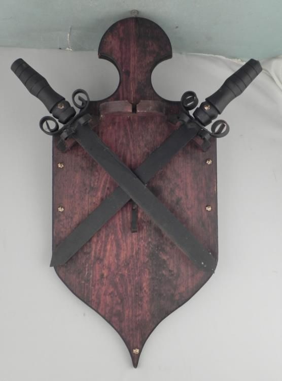VINTAGE DOUBLE CROSSED MEDIEVAL SWORDS ON A WOOD SHIELDVERY WELL MADE WOOD SHIELD WITH 2 CROSSED SHORT SWORDS WITH METAL BLADES AND WOOD GRIPS-APPROX 16X25"