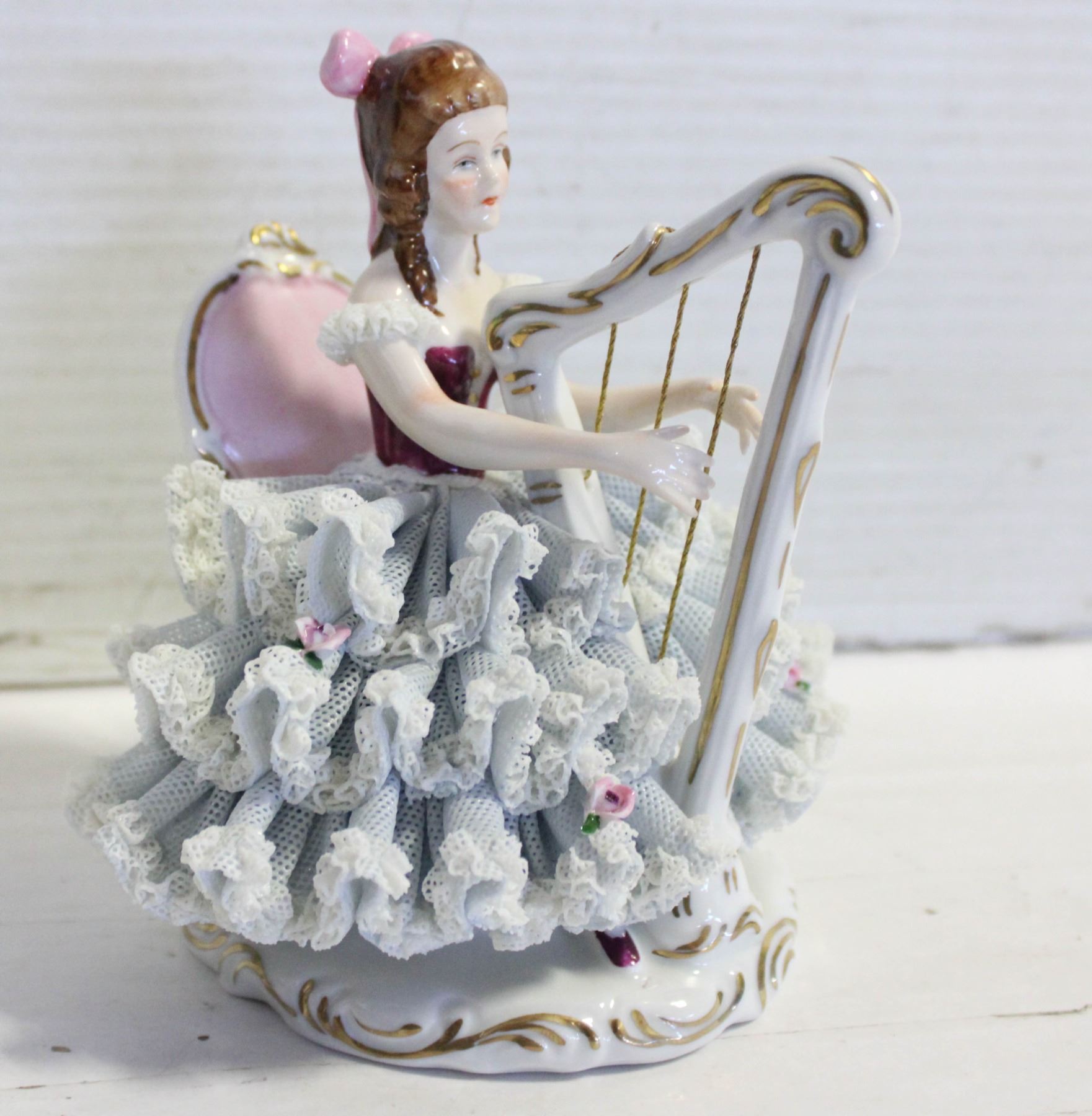VINTAGE DRESDEN GERMANY LACE WOMAN PLAYING HARP 6"