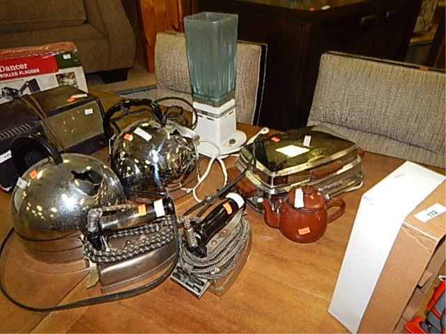 VINTAGE ELECTRIC IRONS - 2, KETTLES - 2 & WAFFLE MAKER & MIXER ETC