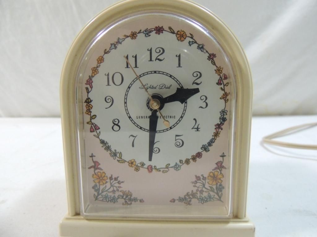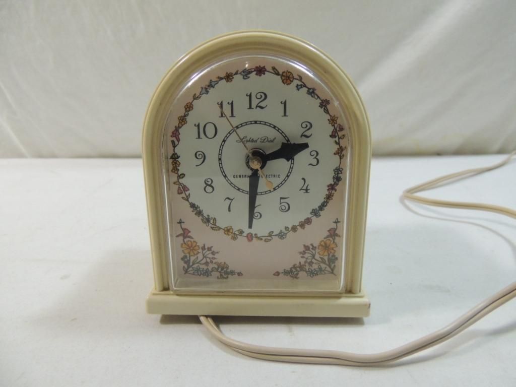 LIGHT DIAL GENERAL ELECTRIC SMALL DECORATIVE NIGHT STAND CLOCK. AS SHOWN SEE PHOTO FOR MORE DETAILS.