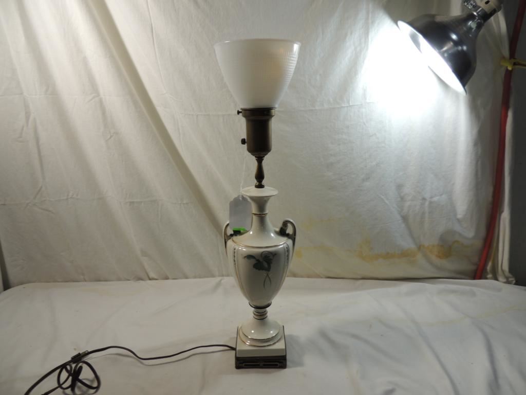 VASE PEDISTAL LAMP CERAMIC PORCELAIN HAND PAINTED GOLD PAINT TRIM GLASS SHADE VINTAGE AS SHOWN SEE PHOTO FOR MORE DETAILS.