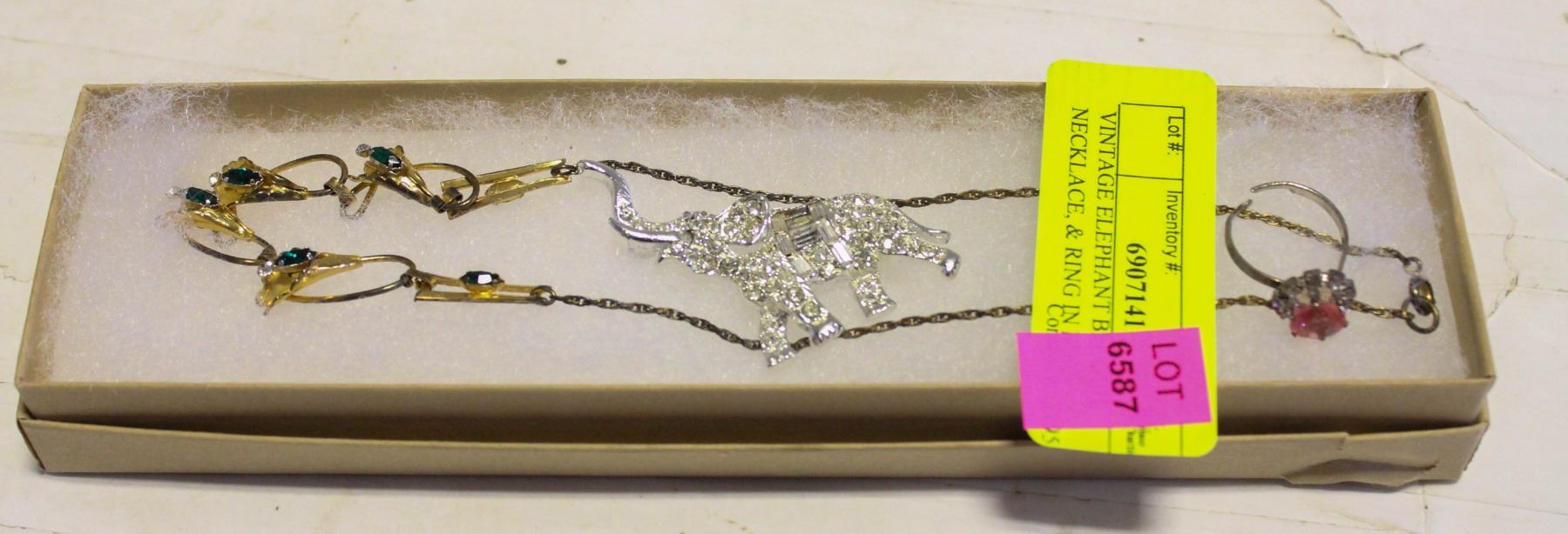 VINTAGE ELEPHANT BROOCH, NECKLACE, & RING IN BOX
