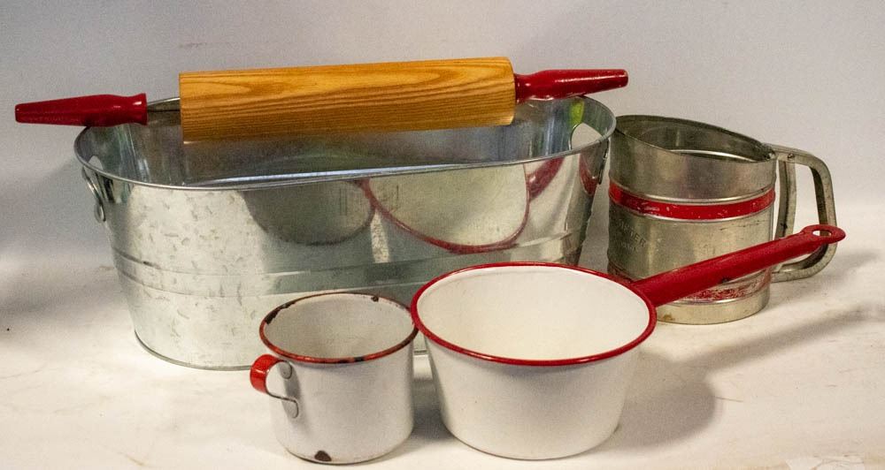 VINTAGE ENAMEL, ROLLING PIN & SIFTER IN METAL