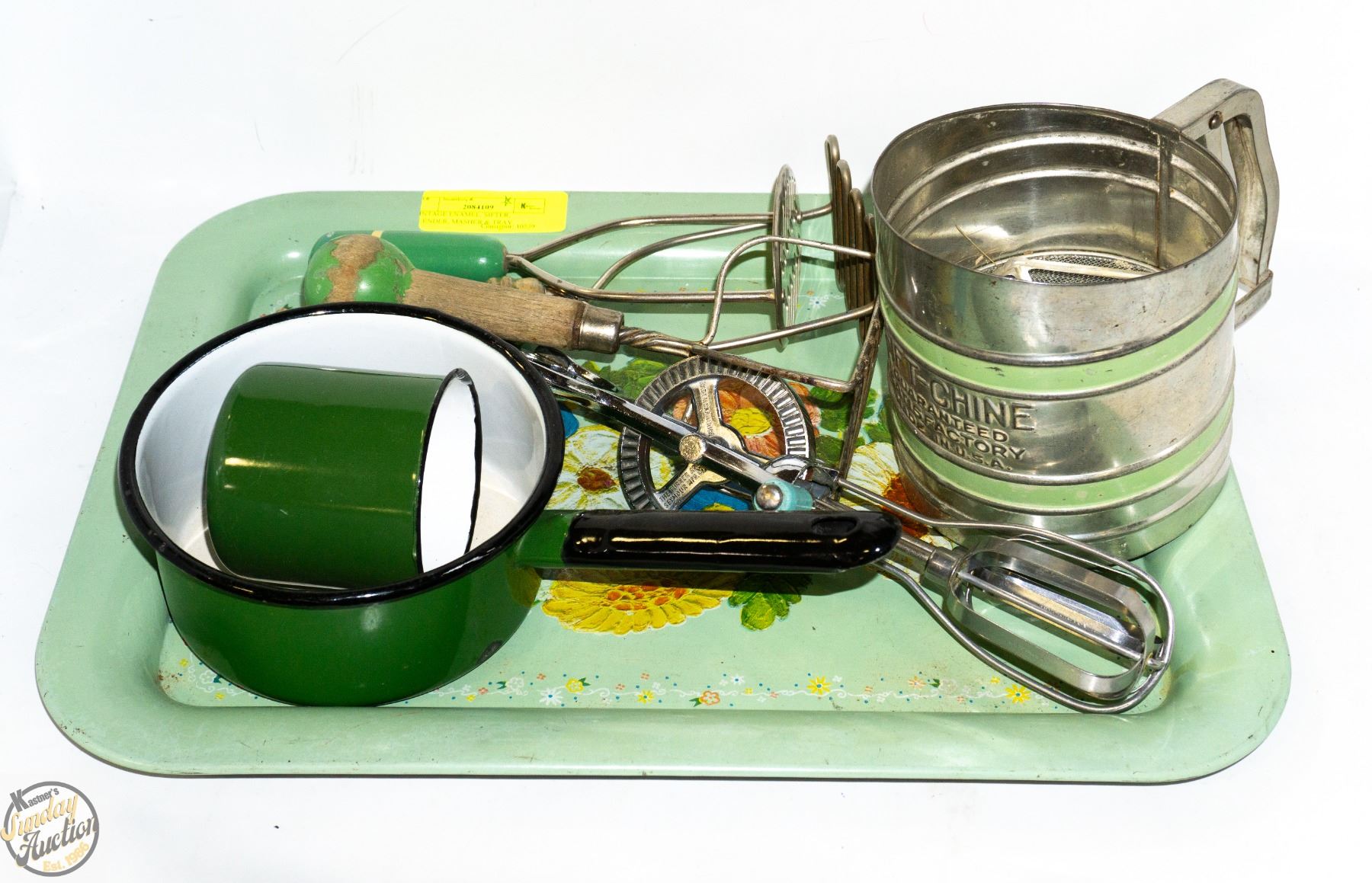 VINTAGE ENAMEL, SIFTER, BLENDER, MASHER & TRAY