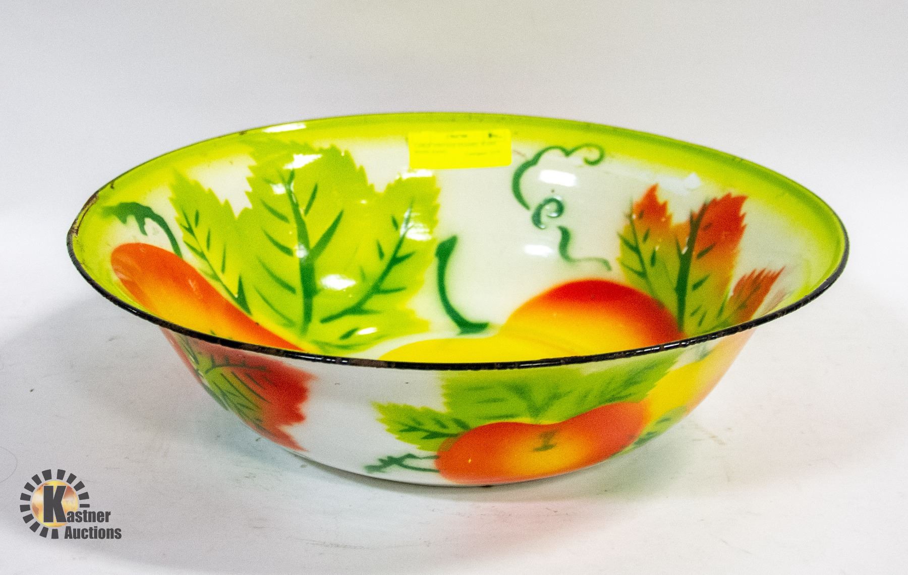 PAINTED 16" DIAMETER VINTAGE ENAMELED BASIN HAND PAINTED FRUIT **ALL ITEMS MUST BE REMOVED BY 5PM SATURDAY, MAY 13TH 2023. ALL REMAINING ITEMS WILL BE SUBJECT TO A $6.00 PER DAY STORAGE CHARGE. ANY ITEMS REMAINING AFTER MONDAY, MAY 29TH, 2023 WILL BE CONSIDERED FORFEITED. NO REFUNDS WILL BE ISSUED FOR FORFEITED ITEMS. TO SCHEDULE A PICK UP APPOINTMENT CLICK HERE