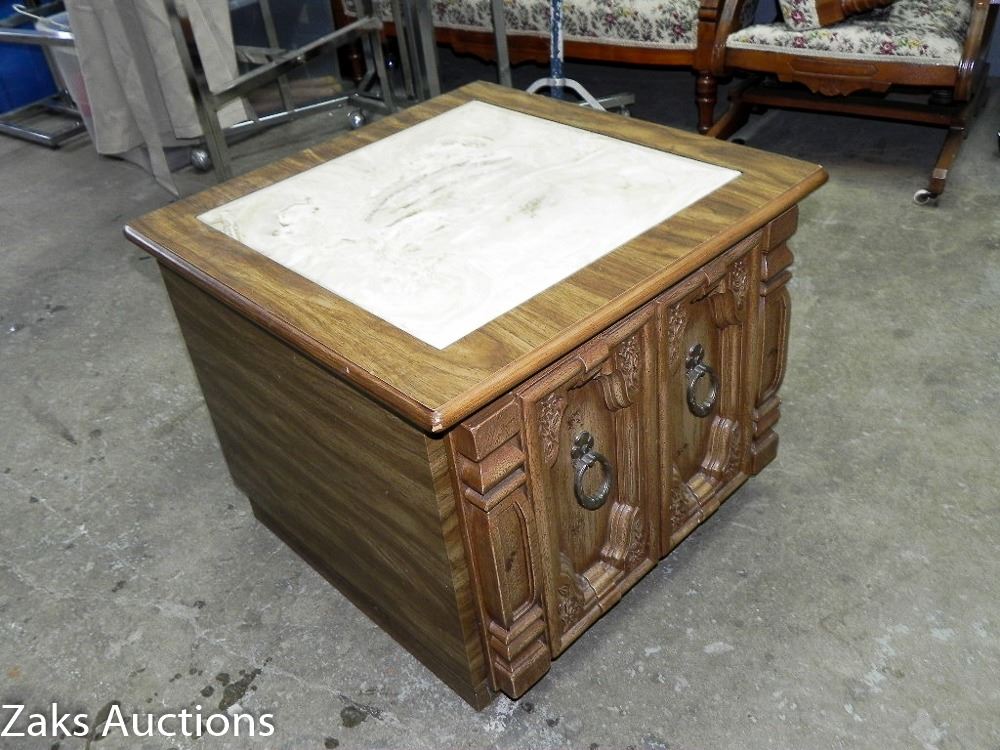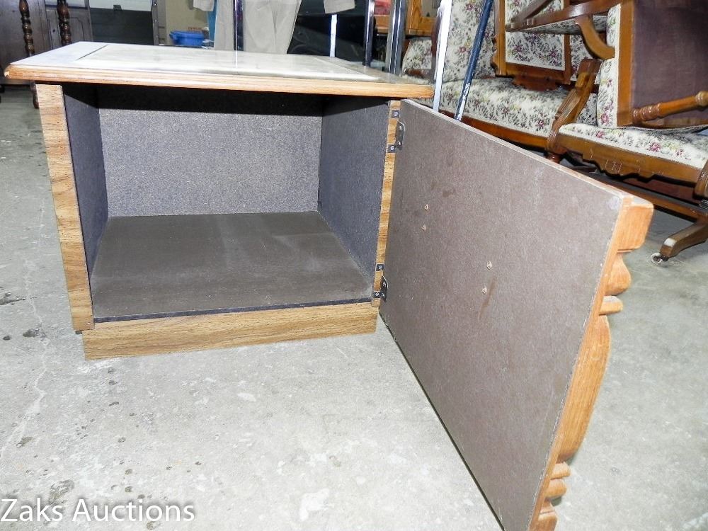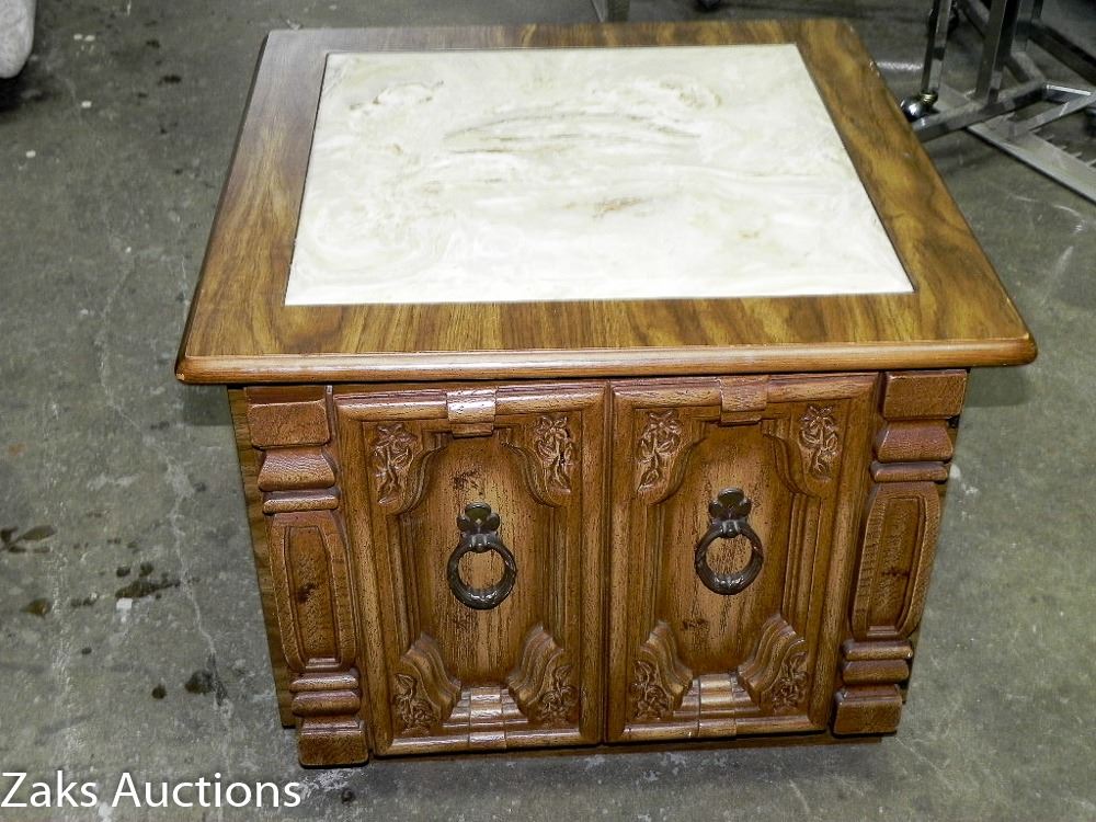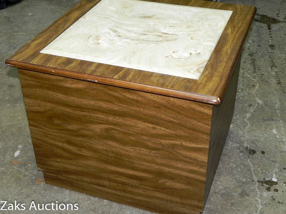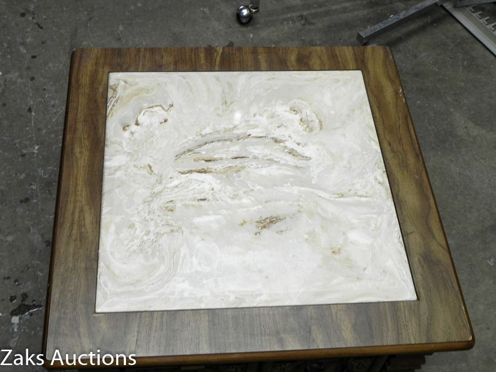 VINTAGE END TABLE. REMOVABLE/REPLACEABLE TOP INSERT. MEASURES 24" WIDE 24" DEEP 19.5" HIGH