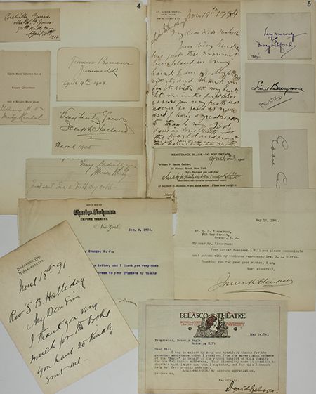 A group of 14 pieces by famous entertainers in different formats (noted), includes: MARY PICKFORD (signature), EDDIE CANTOR (signature), BLANCH RING (check receipt), JOHN MCCULLOUGH (A.L.S.), JOSEPH JEFFERSON (T.L.S.), JEROME HAINES (T.L.S.), DAVID BELASCO (T.L.S.), JOSEPH HOLLAND (sig), MARION KERB (sig) and others. Some mounted, overall very good.