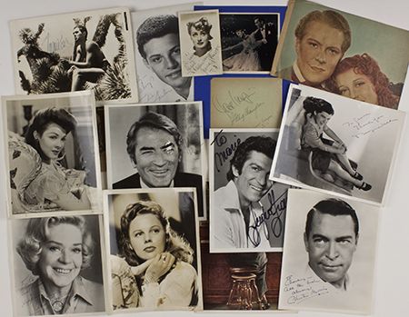 A lot of 13 items by vintage entertainers, most in 8" x 10" signed photo format, includes: JIMMY DURANTE, JUNE ALLYSON, ALICE FAYE, KATHRYN GRAYSON, FRANKIE AVALON, JEANETTE MACDONALD, SERGIO FRANCHI, GREGORY PECK, TYRONE POWER, JUNE HAVOC, CHESTER HIMES, and more. Condition varies from just fair to very good, may contain secretarial examples; should be viewed.