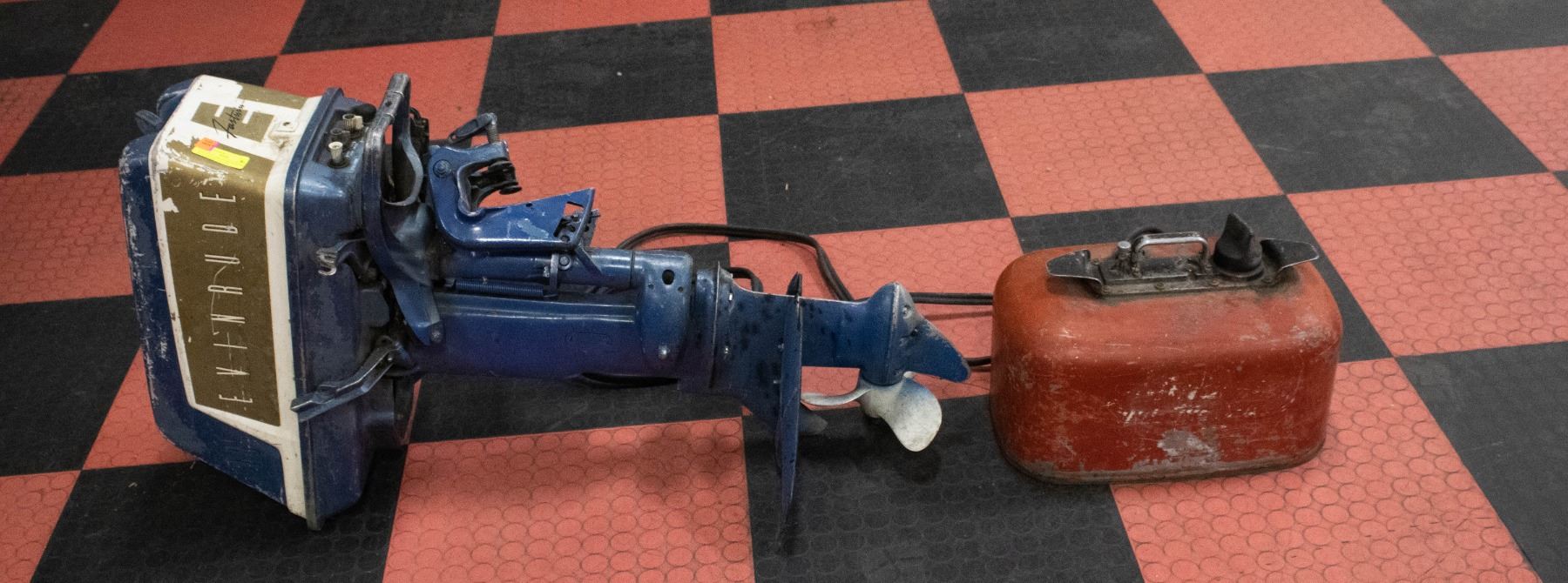 VINTAGE EVINRUDE BOAT MOTOR W/ OUTBOARD GAS CAN