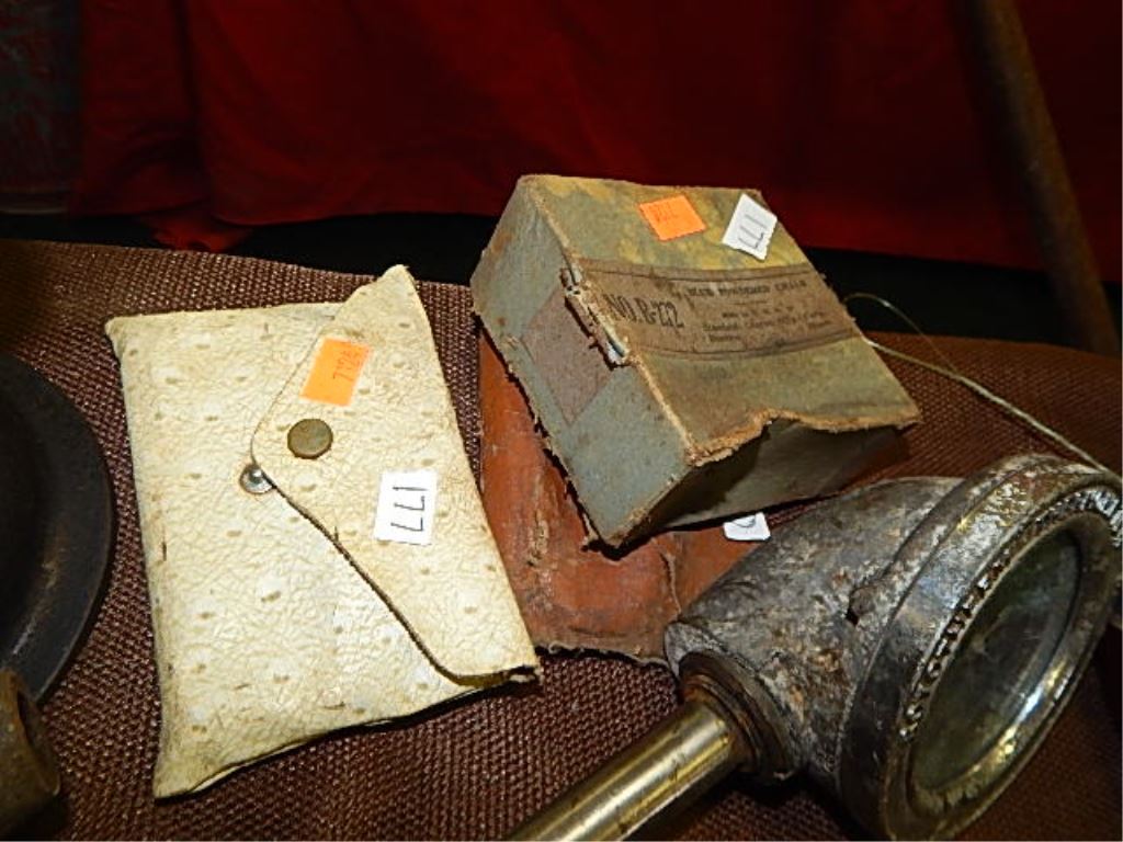VINTAGE EZ MARK BUTT GUAGE FOR DOOR HINGES IN CASE WITH INSTRUCTIONS, VINYL GLUE POWDER CHALK IN BOX & EZ MARK 3 ½" BUTT GUAGE I N CASE WITH INSTRUCTIONS