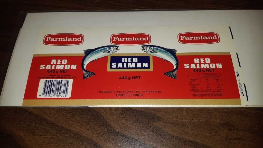 VINTAGE FARMLAND RED SALMON LABEL 9.75" X 4.75" PRODUCT OF CANADA G. J. COLES AND COY, PTY. LTD. - A