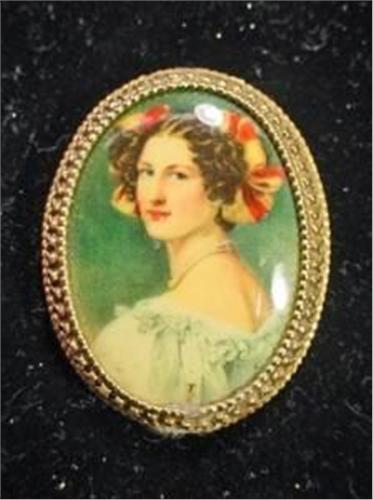 VINTAGE FASHION PORTRAIT PIN SET IN A GOLD METAL DECORATIVE SETTING.