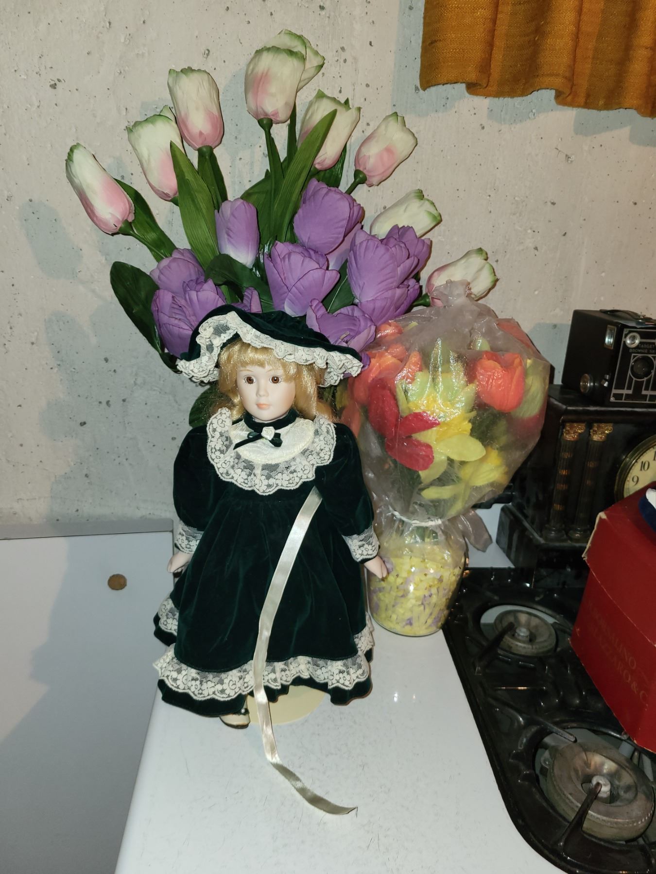 VINTGE FAUX FLOWERS AND A PORCELAIN DOLL