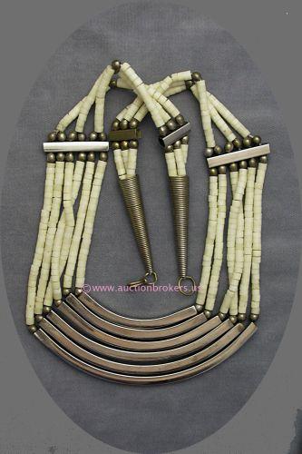 VINTAGE FAUX IVORY THREE STRAND OF GRADUATED LENGTH BEADS AND SILVER METAL SEPARATORS.